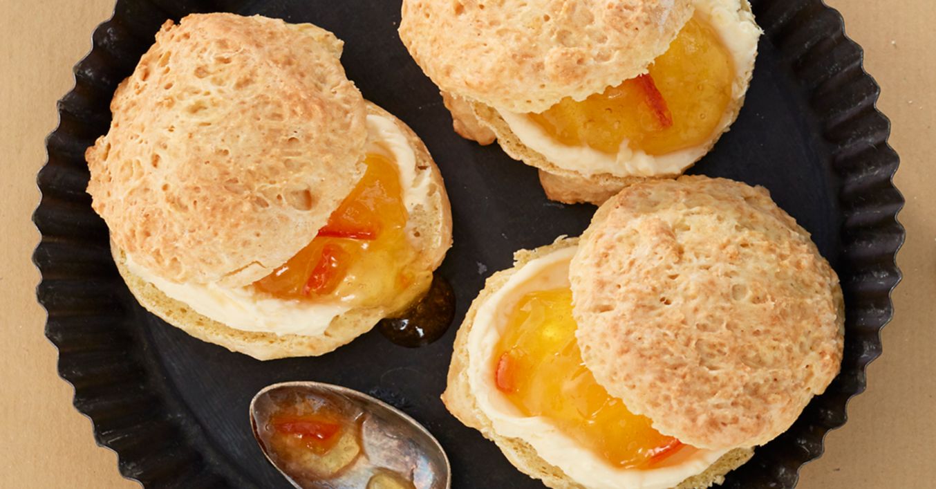 Die Scones in der Mitte aufschneiden und mit Clotted Cream und Orangenmarmelade bestrichen servieren.