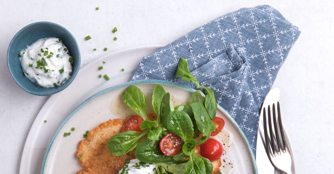 Aus dem Pfannkuchenteig im heißen Öl 4 goldbraune Pfannkuchen ausbacken und mit Schnittlauchquark und Salat servieren.