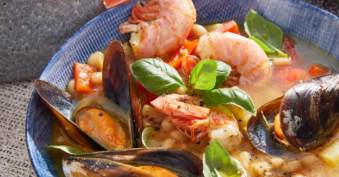 In der Zwischenzeit Paprika halbieren, putzen, waschen, abtropfen lassen, in 1 bis 2 cm große Stücke schneiden und nach circa 40 Minuten zum Eintopf geben. Garnelen und Miesmuscheln putzen, dabei offene Muscheln entsorgen. Fischfilet kalt abspülen, abtropfen lassen und in mundgerechte Stücke schneiden. Garnelen und Muscheln ebenfalls kalt abspülen, abtropfen lassen und mit dem Fisch zum Eintopf geben. Weitere circa 10 Minuten köcheln lassen. Mit Salz und Pfeffer abschmecken.