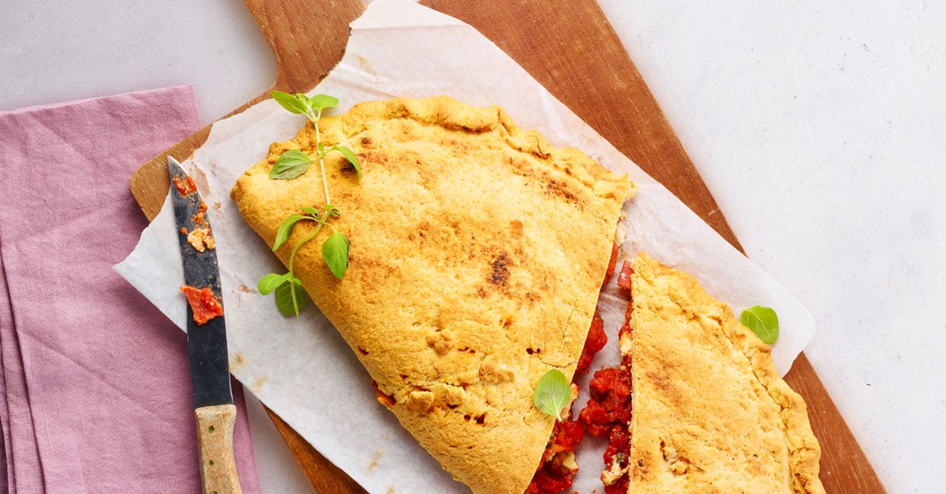 Teig zusammenklappen, Ränder umschlagen und gut andrücken. Calzone auf ein mit Backpapier ausgelegtes Backblech geben, mit Olivenöl bestreichen, mit Oregano bestreuen und circa 30 Minuten backen (Elektro- und Erdgasbackofen 200 °C/Stufe 4, Umluft 180 °C).