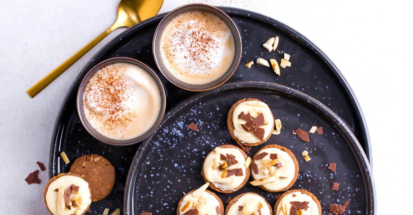 Eigelb, Butter, Zucker, Mehl, Cappuccinopulver, Kakaopulver und 100 Gramm Mandeln zu einem glatten Teig verkneten und circa 30 Minuten kalt stellen.