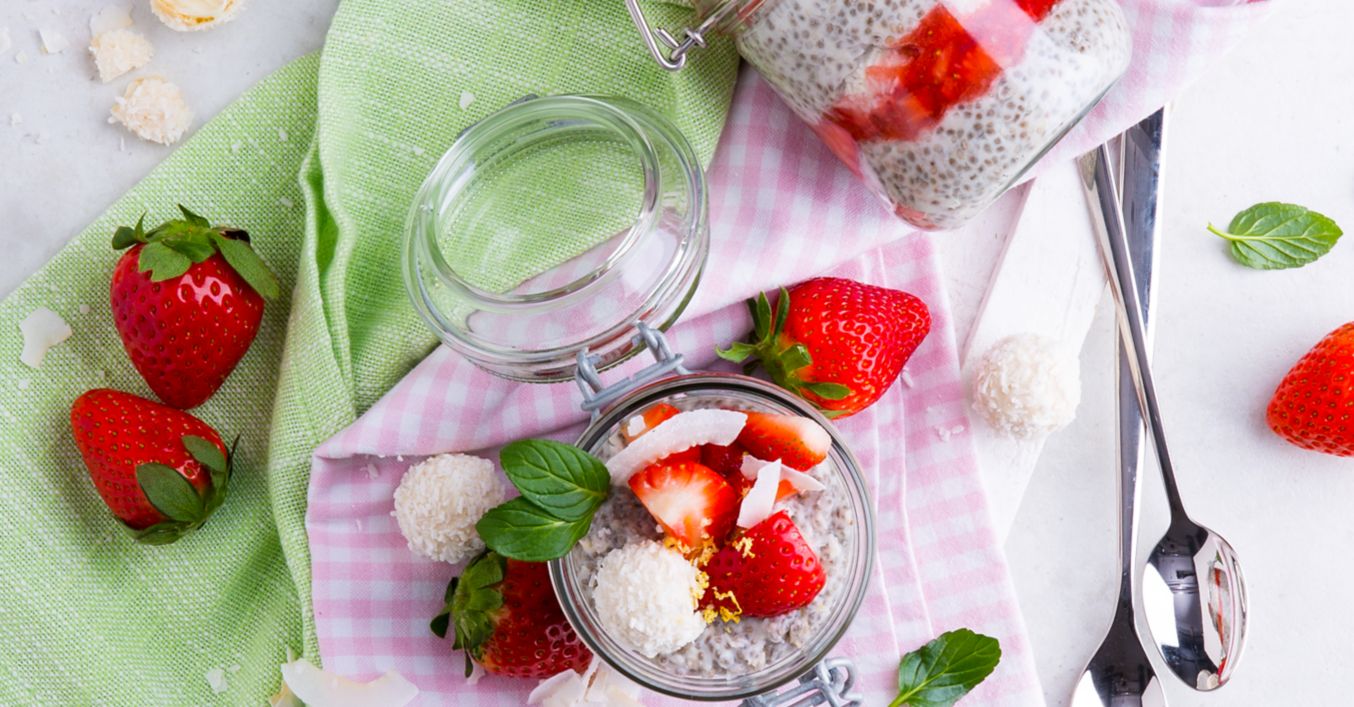 Restlichen Chia-Pudding und marinierte Erdbeeren auf die Gläser verteilen und mit übrigen Raffaello, Erdbeerhälften und nach Wunsch mit Minze dekoriert servieren.