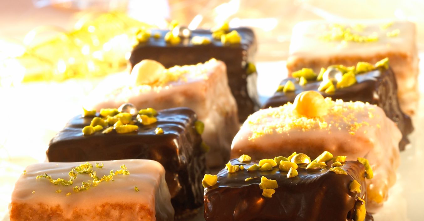 Für die Garnitur Kuvertüre schmelzen. Gefüllte Böden in circa 4 mal 4 Zentimeter große Würfel schneiden, Chiliwürfel mit Kuvertüre überziehen und mit gehackten Pistazien bestreuen.