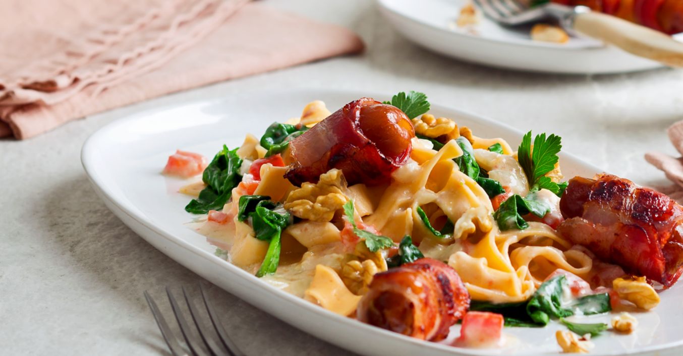 Nudeln nach Packungsangabe in gesalzenem Wasser kochen. In einer Pfanne das restliche Öl erhitzen, darin die Datteln im Speckmantel 2 bis 3 Minuten braten. Tomaten dazugeben und 2 bis 3 Minuten braten.