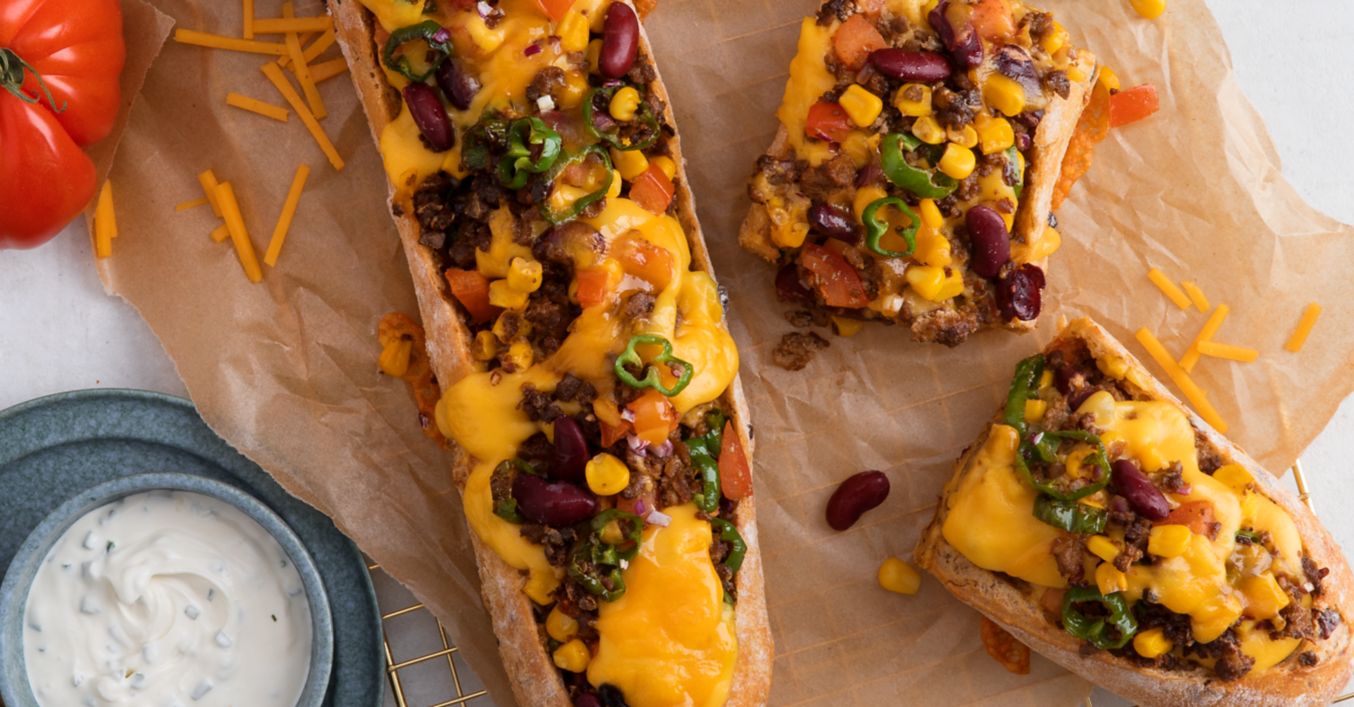 Baguettes mit den Brotwürfeln auf das Backblech geben und die Hälfte der Hack-Mischung auf die beiden Mulden verteilen. Je ein Viertel der Käsesoße darauf verteilen, restliche Hackmischung darauf geben, mit übriger Käsesoße toppen und mit restlichem Cheddar bestreut im vorgeheizten Ofen circa 10 Minuten goldgelb backen.