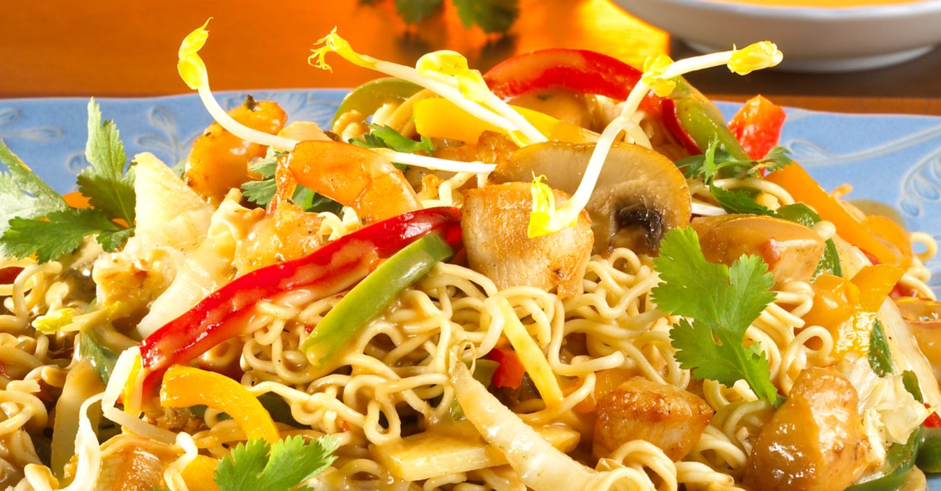 Öl in einem Wok oder einer großen Pfanne erhitzen, Fleisch ca. 5 Minuten darin anbraten und herausnehmen. Paprika- und Chinakohlstreifen mit Champignonscheiben im Bratensatz ca. 5 Minuten anbraten und mit 1 Teelöffel Sambal Oelek und Sojasoße würzen. Mit Kokosmilch und Brühe ablöschen und etwas einkochen lassen. Hähnchenwürfel und Garnelen mit Nudeln untermischen und mit Sambal Oelek und Sojasoße kräftig abschmecken. Koriander hacken und Nudelpfanne damit bestreuen.