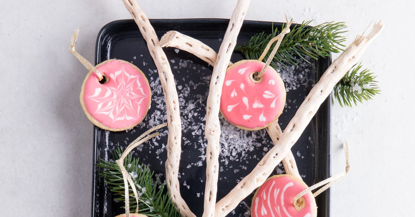 Plätzchen zum Aufhängen am Tannenbaum auf dekoratives Garn fädeln.