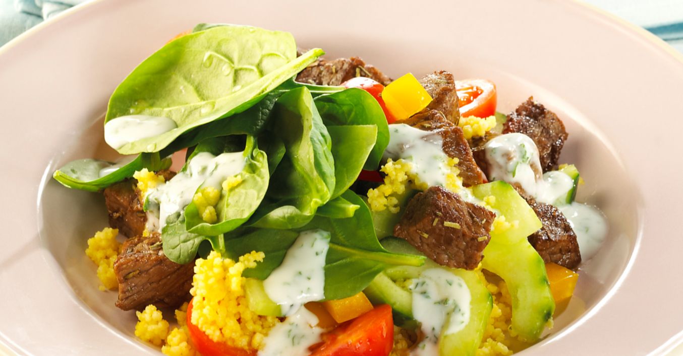 Spinat, Couscous und Steakwürfel dekorativ auf Teller anrichten, mit dem Dressing beträufeln und servieren.