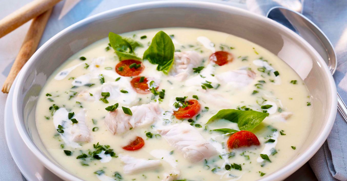 Fisch waschen, trockentupfen, in Stücke schneiden, salzen und pfeffern und in der Suppe circa 4 bis 6 Minuten garziehen lassen. Tomaten zufügen und Suppe nach Wunsch mit Kräuterblättchen garniert servieren. Dazu schmecken Grissini.