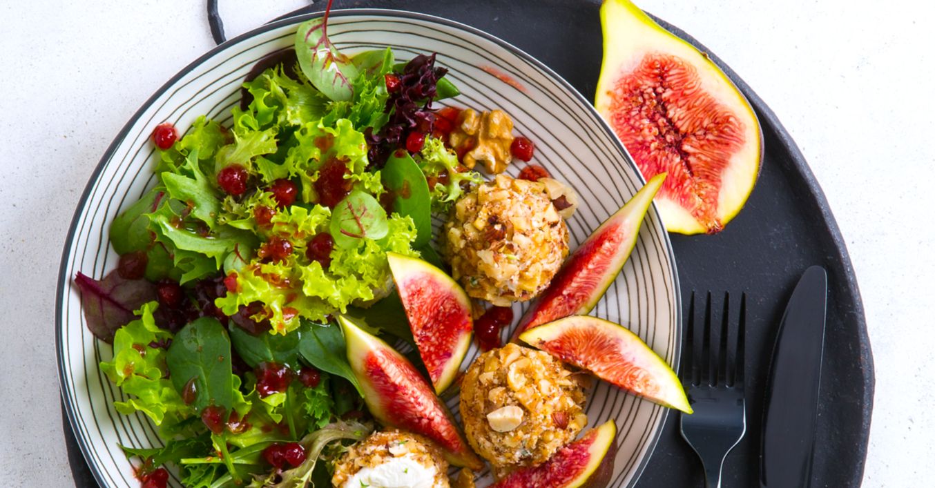 Cremige Nusskugeln und Feigen auf marinierten Blattsalaten
