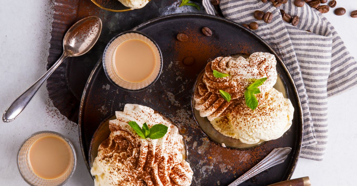 Eis auf 6 Dessertgläser verteilen und mit Sahne toppen. Vor dem Servieren mit Kakaopulver berieseln und nach Wunsch mit Minzblättchen garnieren.