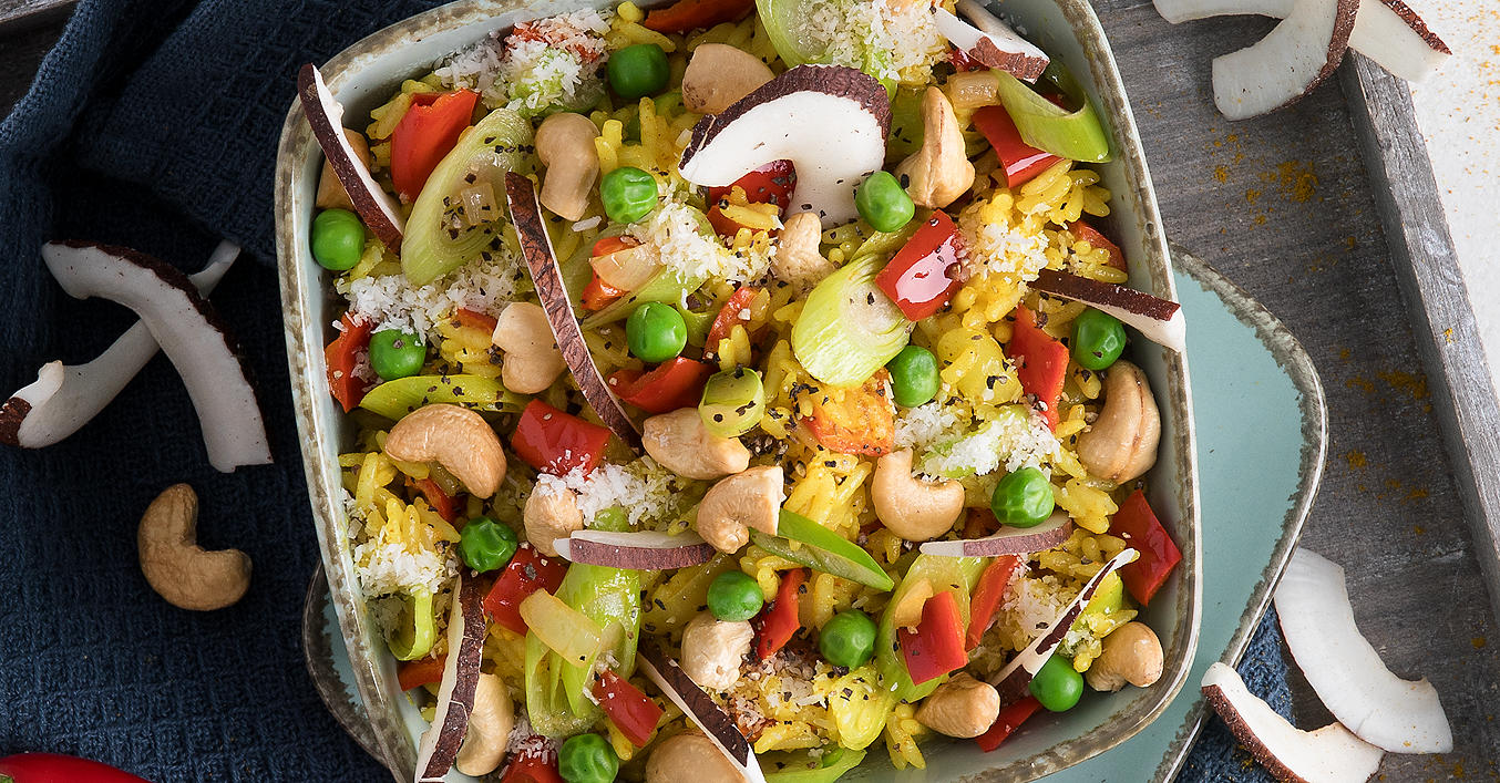 Curry-Gemüsereis mit Cashewkernen und Kokos