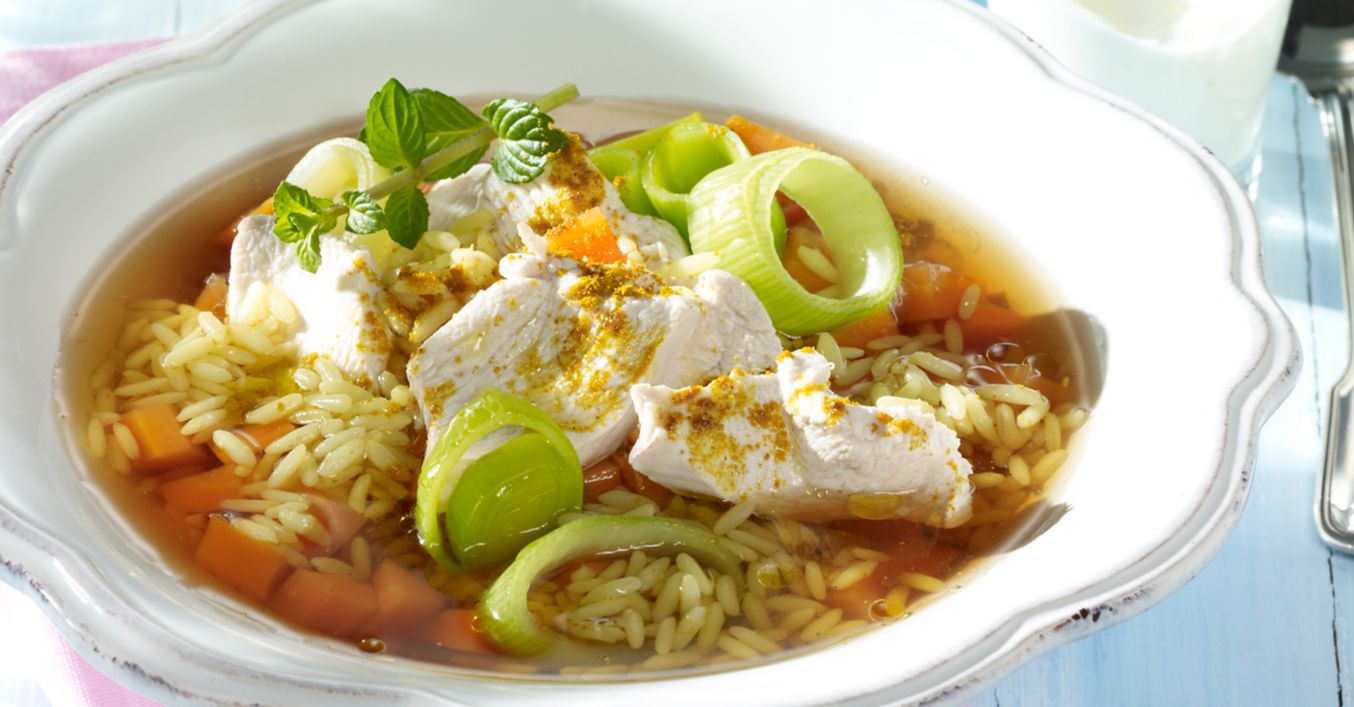 Brühe aufkochen, Möhren, Lauch und Reis zufügen und abgedeckt ca. 15-20 Minuten garen. Fünf Minuten vor Ende der Garzeit die Hähnchenbrust dazugeben und mit garen.