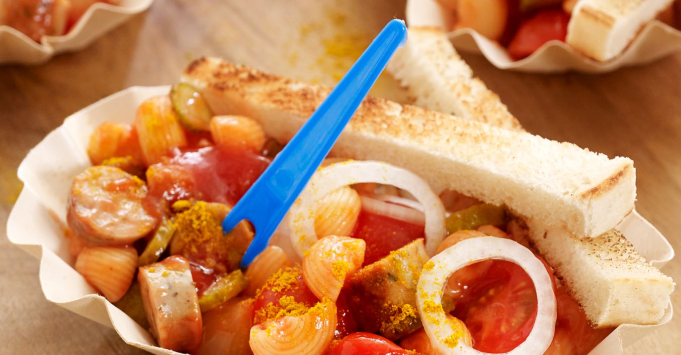 Wurstscheiben, Gewürzgurken, Silberzwiebeln, Zwiebel, Tomaten und Nudeln mit der Soße vermischen, in dekorative Cups füllen und warm oder kalt mit Toaststreifen servieren.