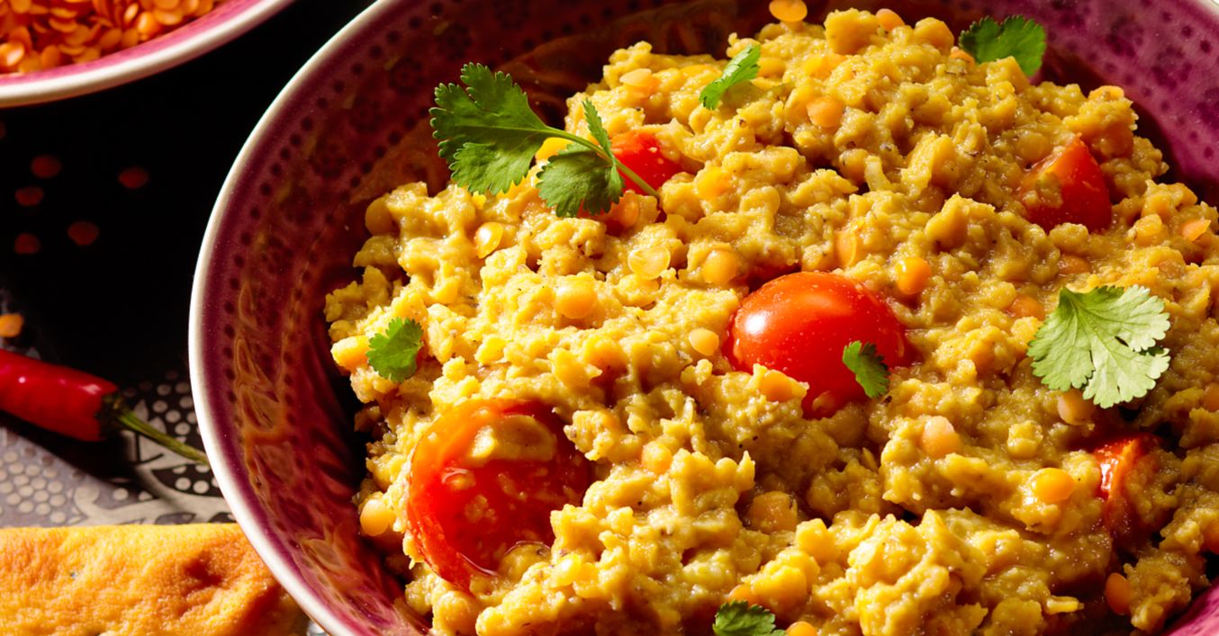 Nach dem Kochen die Chilistücke entfernen und Dal mit Kurkuma, Kreuzkümmel, Koriander und Salz abschmecken. Tomaten waschen, halbieren und mit Kokosmilch unterheben. Dal nach Wunsch mit Naan-Brot und mit Kräutern garniert servieren.