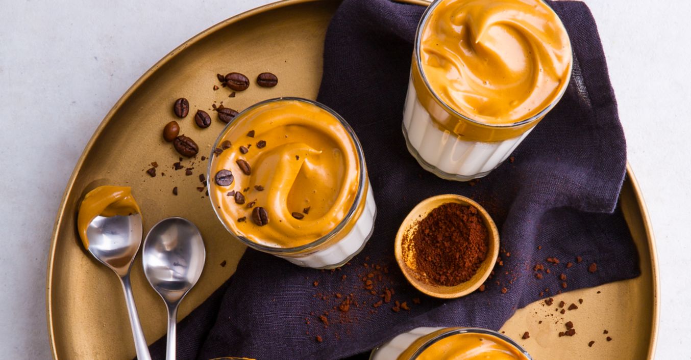 Milch in einem Topf erwärmen, auf 2 Gläser verteilen und mit der aufgeschlagenen Kaffeecreme servieren.