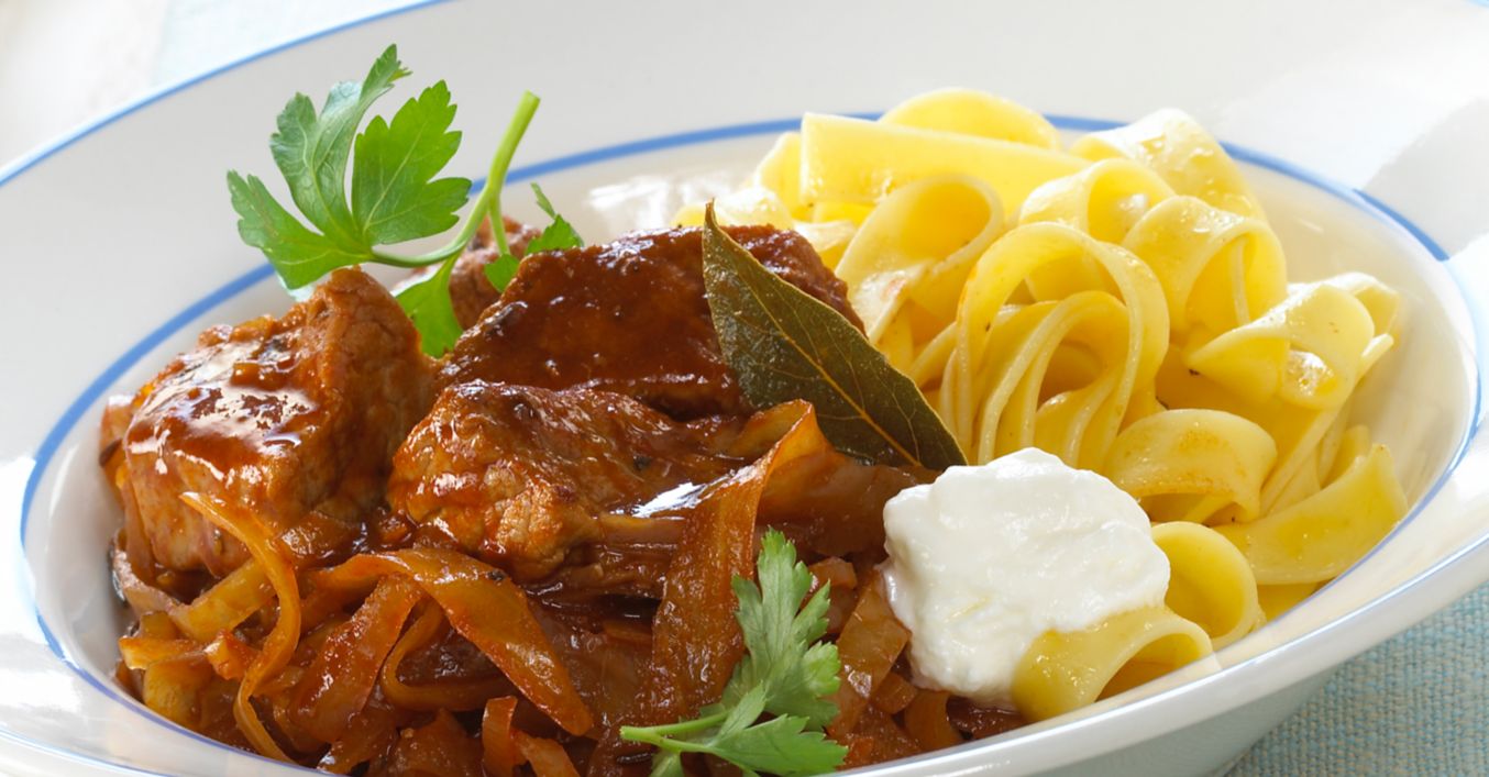 Gulasch mit Schmand verfeinern, abschmecken und mit Nudeln servieren.