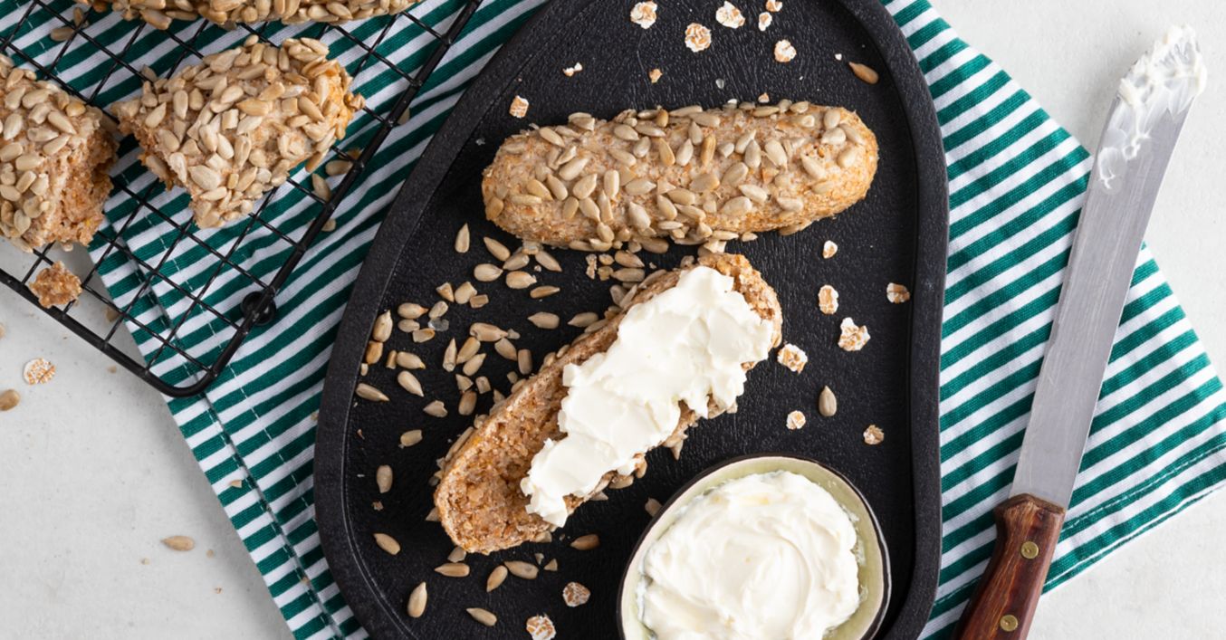Frühstücksstangen abkühlen lassen, längs halbieren, mit Frischkäse und Honig bestreichen und genießen.