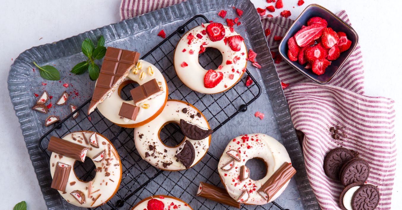 Die Donuts vorsichtig für circa 60 bis 90 Sekunden je Seite ausbacken. Anschließend auf Küchenpapier abtropfen lassen. 2/3 der weißen Kuvertüre in einer Schüssel über einem Wasserbad schmelzen. Anschließend das letzte Drittel hinzufügen. Die Donuts kopfüber in die geschmolzene Kuvertüre eintunken und mit Süßigkeiten dekorieren. Anschließend vollständig trocknen lassen.