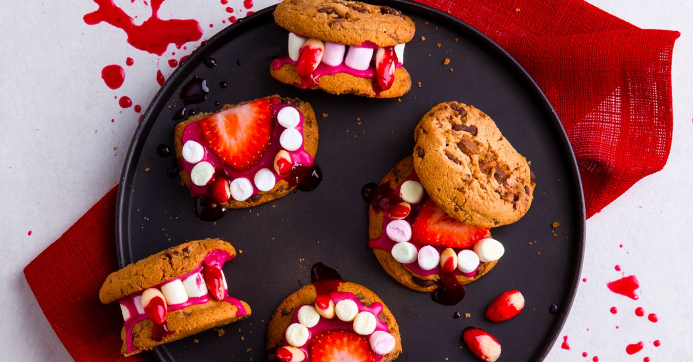 Alle Drakulakekse mit jeweils 2 Mandeln als Vampirzähne verzieren und nach Geschmack mit ein wenig Erdbeermarmelade bestreichen.
