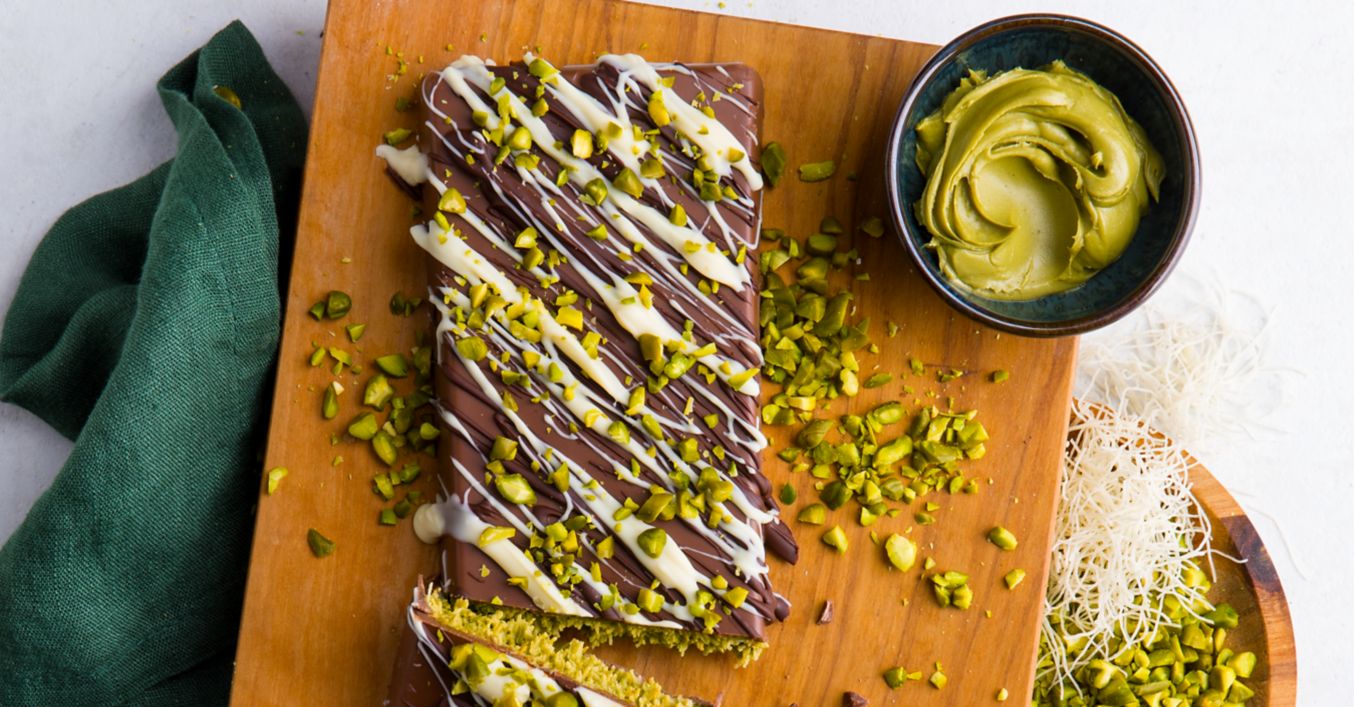 Pistazien-Füllung in die Form geben und glattstreichen. Restliche Kuvertüre falls nötig erneut über dem Wasserbad schmelzen und über der Füllung verteilen, so dass sie vollständig abgedeckt ist. Dubai-Schokolade aus der Form nehmen und die Unterseite nach oben drehen.