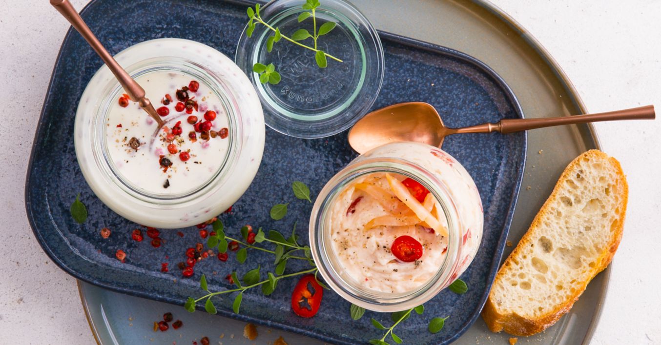 Für die Heilbuttcreme Heilbutt mit Creme fraîche pürieren, Pfefferbeeren unterheben und mit Salz und Pfeffer abschmecken. Lachsmousse und Heilbuttcreme in kleine Weckgläser füllen und nach Wunsch mit geröstetem Baguette servieren.