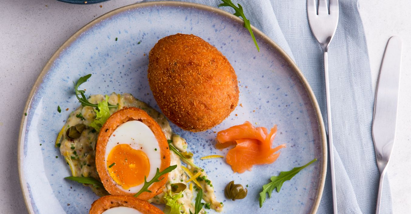 Lachshülle mit leicht bemehlten Händen glattrollen. Die Eier von allen Seiten dünn im restlichen Paniermehl wenden und im erhitzten Pflanzenöl nacheinander circa 2 Minuten frittieren. Auf Küchenpapier abtropfen lassen.