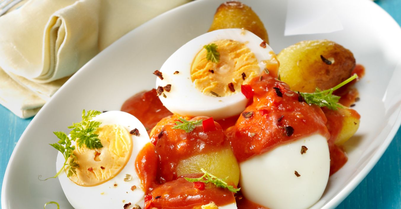 Eier in die Soße geben und kurze Zeit ziehen lassen. Kartoffeln im restlichen erhitzten Öl goldbraun rösten, mit Eiern und Soße auf Tellern anrichten und servieren.