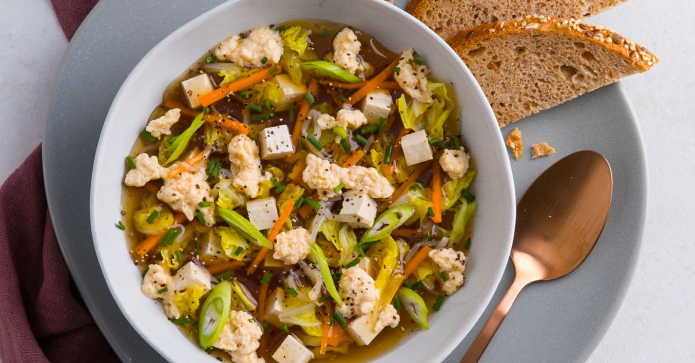 Gemüse und Tofu in die Brühe geben und circa 3 Minuten garen. Eier aufschlagen, verquirlen, in die Suppe gießen und zu „Blumen“ stocken lassen.