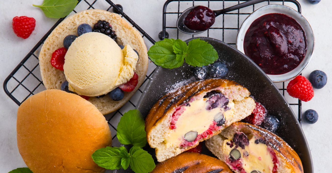 Die Beerenmischung in den ausgehöhlten Brötchenhälften verteilen und je 1 Kugel Eis auf die untere Hälfte setzen. Deckel auflegen, etwas andrücken und für mindestens 2 Stunden – am besten über Nacht – einfrieren.