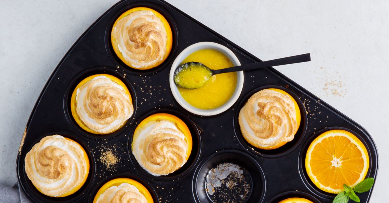Baiser auf das gefrorene Eis in den Orangenschalen geben und damit gut bedecken.