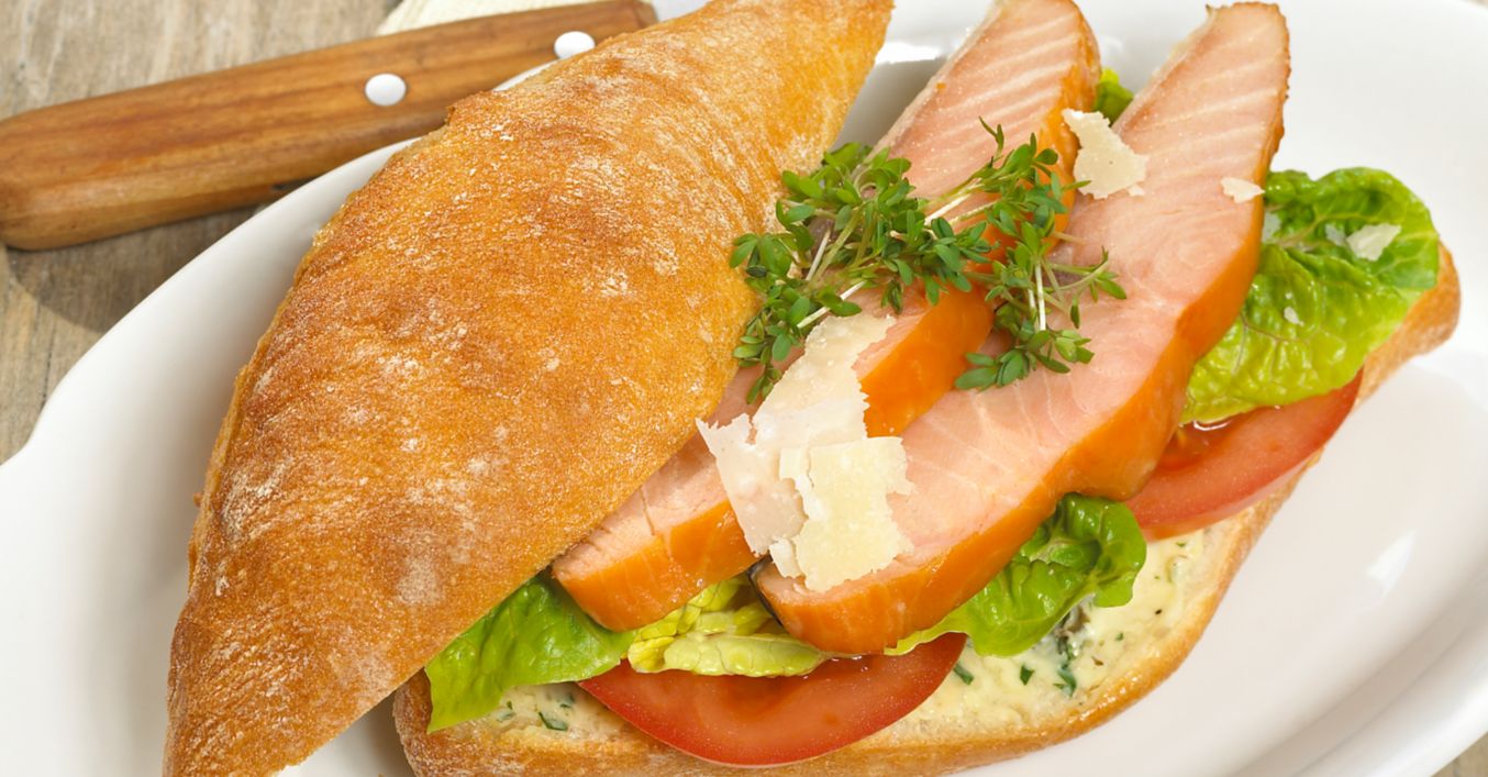 Salat, Tomaten, Eismeerlachsforellenfilet und Käse auf den unteren Baguettehälften verteilen, Kresse überstreuen, obere Baguettehälften auflegen und servieren.