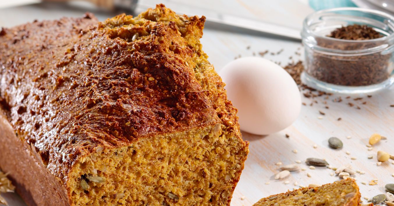 Eier und Quark verrühren, mit Backpulver, Kleie und Salz vermischen. Teig mit Kümmel und Kreuzkümmel würzen und in eine mit Backpapier ausgelegte Kastenform – 25 mal 10 Zentimeter – füllen.