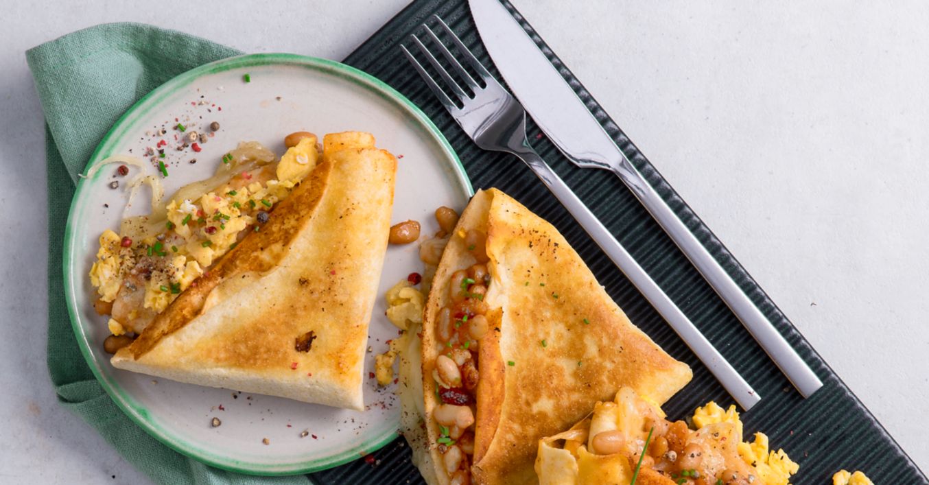 Ein Viertel des Wraps mit Käse belegen, einen Teil mit Baked Beans, einen Teil mit Rührei und den letzten Teil mit der Soße.
