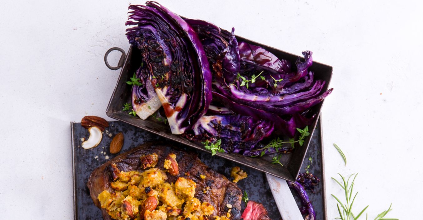 Glühwein, Balsamico und 50 Milliliter Wasser verrühren, mit den Rotkohlspalten in eine feuerfesten Schale geben und abgedeckt circa 20 Minuten garen. Nusskruste gleichmäßig auf der Oberseite der Steaks verteilen und auf dem Rotkohl indirekt bei geschlossenem Deckel 12 bis 15 Minuten weiter garen.