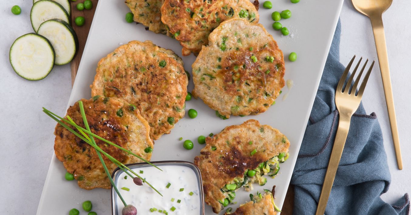 Zucchiniraspel mit den Händen gut ausdrücken, in eine Schüssel geben und mit Eiern, Milch, Mehl und Backpulver zu einem Teig verrühren. Erbsen unterheben und mit etwas Muskatnuss und Salz abschmecken.