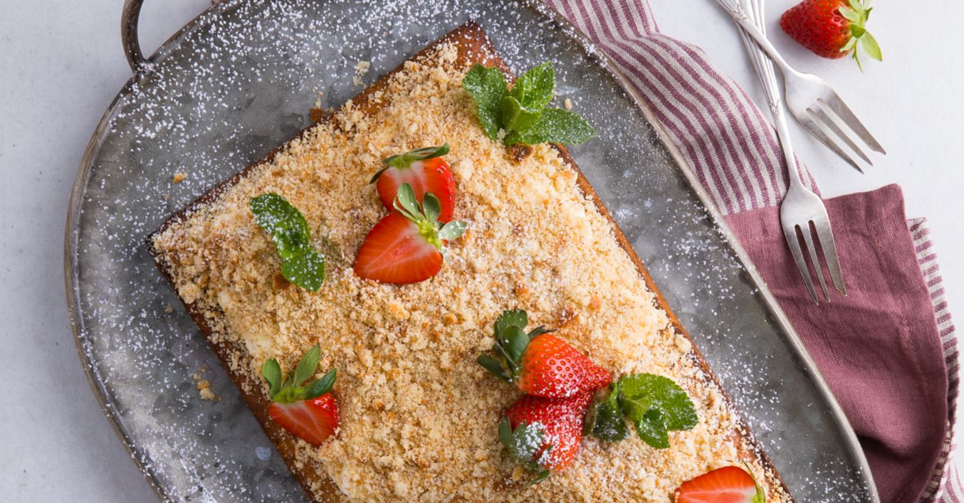 Die Sahne-Quarkcreme auf dem Kuchenboden verteilen. Die Kuchenbrösel auf der Creme verteilen und leicht andrücken. Mindestens 2 Stunden kühl stellen und mit Erdbeeren garnieren.