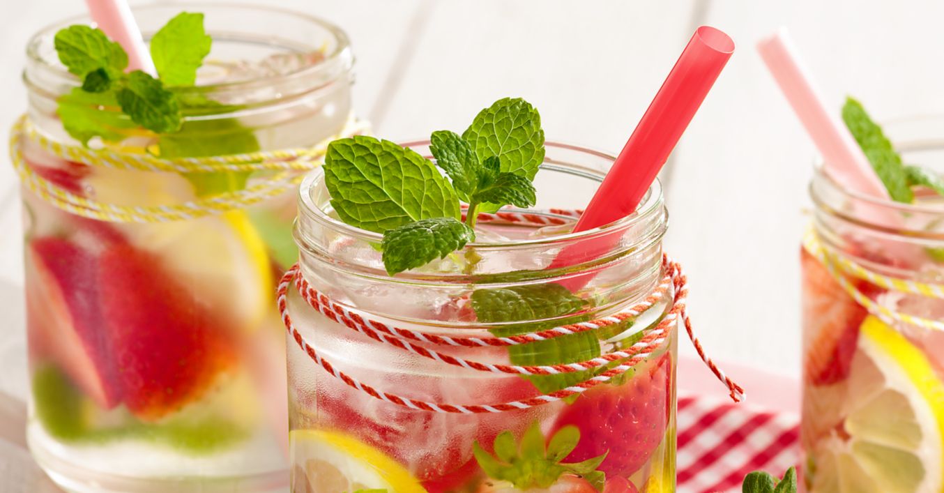 Die Minzblätter kurz zwischen den Fingern reiben. Alles zusammen mit 1 Liter gut gekühltem Wasser und Eiswürfeln in eine große Karaffe oder Schraubglas füllen.