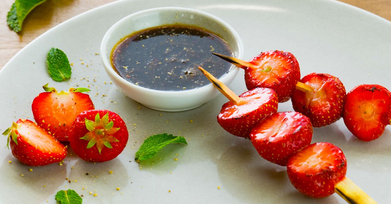Die Erdbeeren waschen, putzen, auf einen gewässerten Holzspieß stecken und von beiden Seiten circa 30 Sekunden auf dem Grill erhitzen. Erdbeerspieße auf einen Teller anrichten und mit der Pfeffersoße beträufelt servieren.