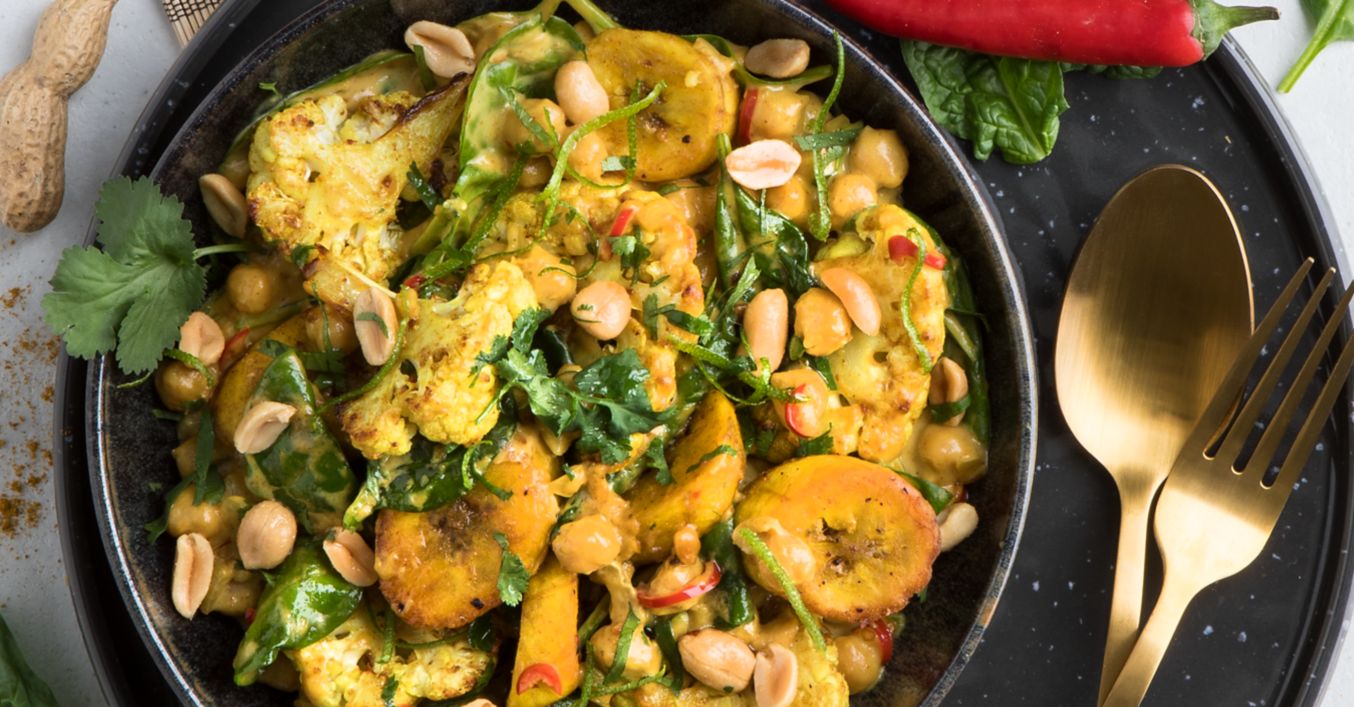Blumenkohl waschen, abtropfen lassen, zu Röschen putzen und in 1 Zentimeter dicke Scheiben schneiden. Kochbananen schälen und in dünne Scheiben schneiden. Zusammen mit 3 Esslöffel Öl, 1 Teelöffel Salz und ½ Esslöffel Currypulver in einer Schüssel vermengen. Auf den Backblechen verteilen, im Ofen circa 25 Minuten backen und beiseitestellen.