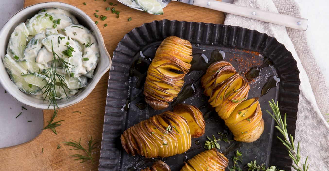 Kartoffeln nach Ablauf der Garzeit aus dem Ofen nehmen (sie sollten goldbraun sein) und zu dem Gurkensalat servieren.