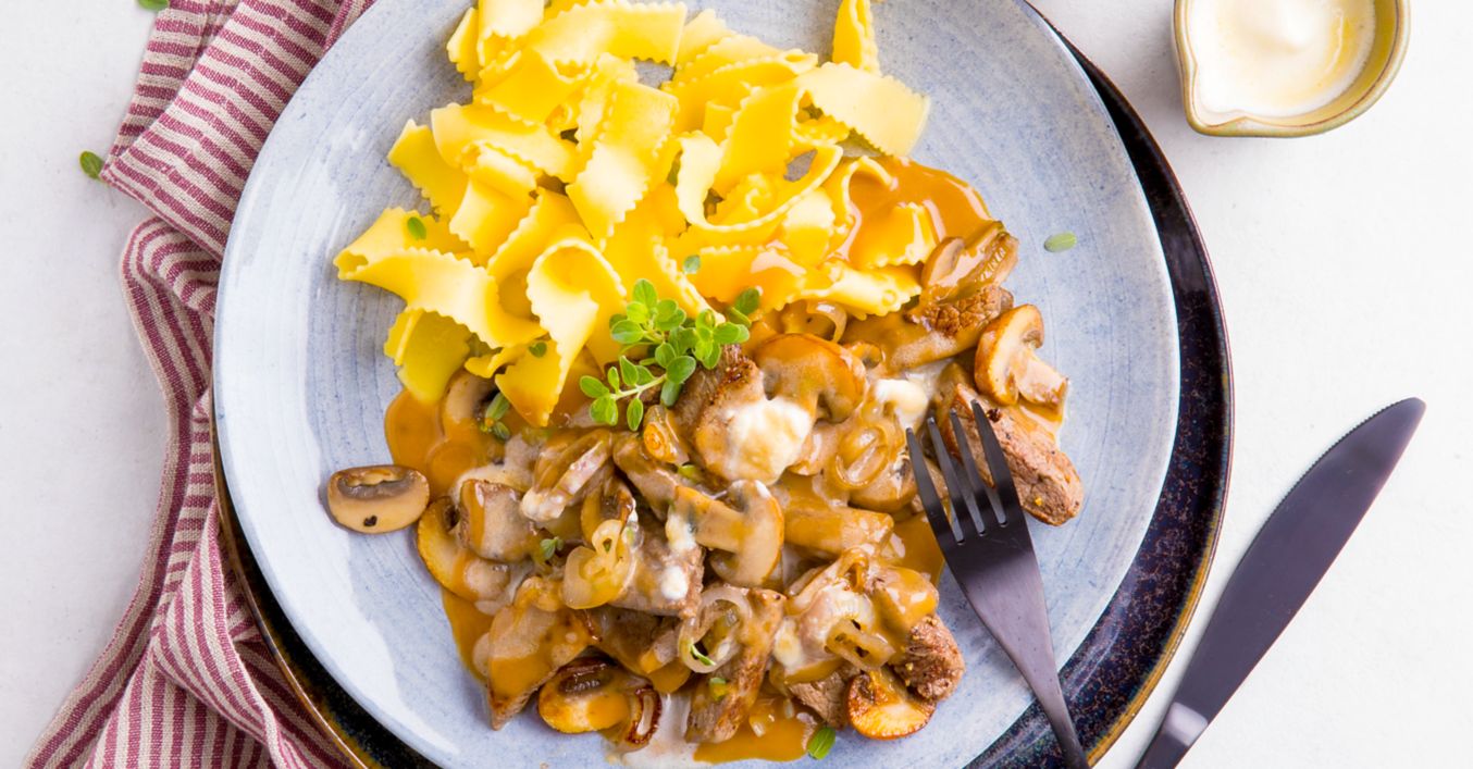 Nudeln nach Packungsanweisung zubereiten. Filet samt Brühe zu dem Schalotten-Sud geben, mit der Mehlbutter abbinden und kurz aufkochen. Sahne leicht anschlagen und unter das Ragout heben. Mit Salz, Pfeffer und Majoran abschmecken. Nudeln abtropfen lassen und mit dem Filetspitzen-Ragout anrichten.