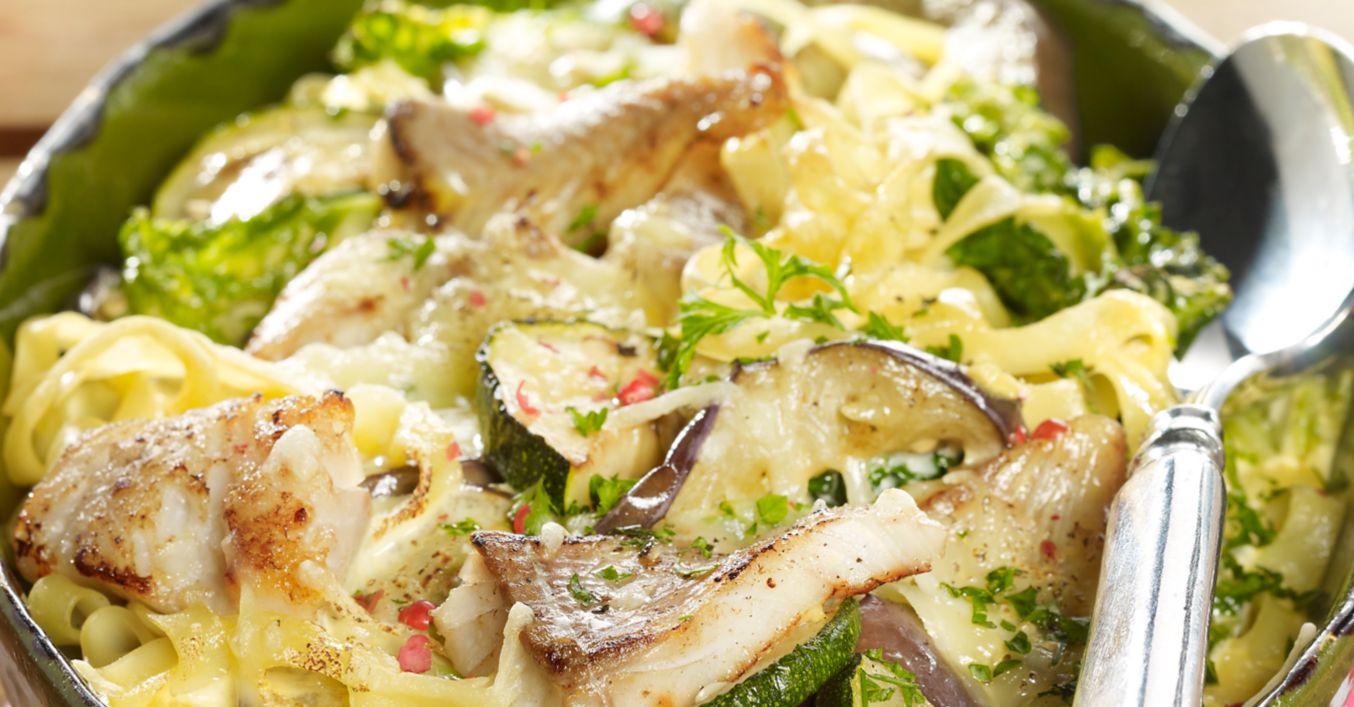 Aubergine und Zucchino in erhitztem Öl anbraten und herausnehmen. Wirsing in kochendem Salzwasser circa 10 Minuten blanchieren. Fisch, Auberginen, Zucchino, Wirsing und Nudeln in eine Auflaufform füllen.