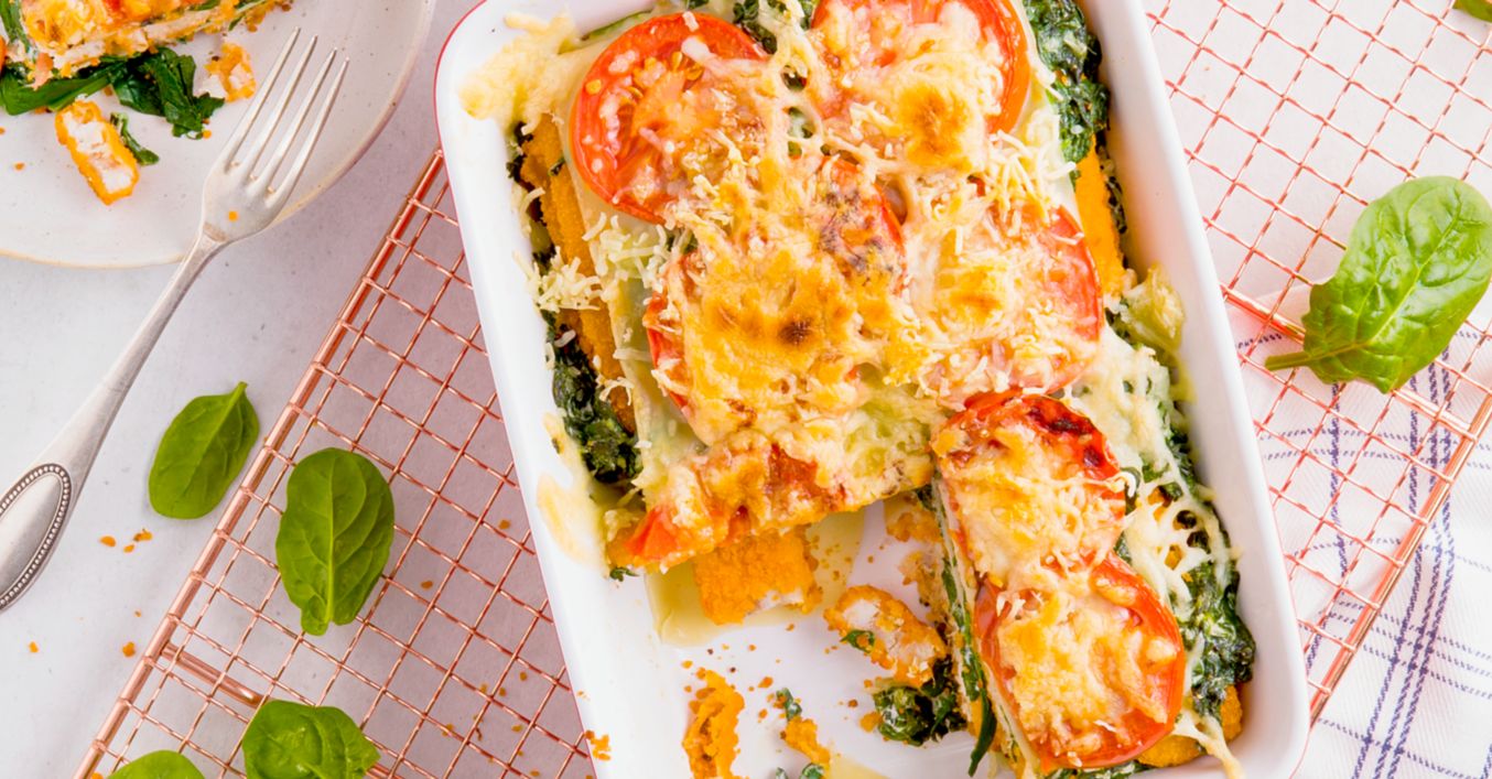 Fischstäbchen abwechselnd mit Spinat und Lasagneplatten in eine Form (15 x 20 Zentimeter) schichten.