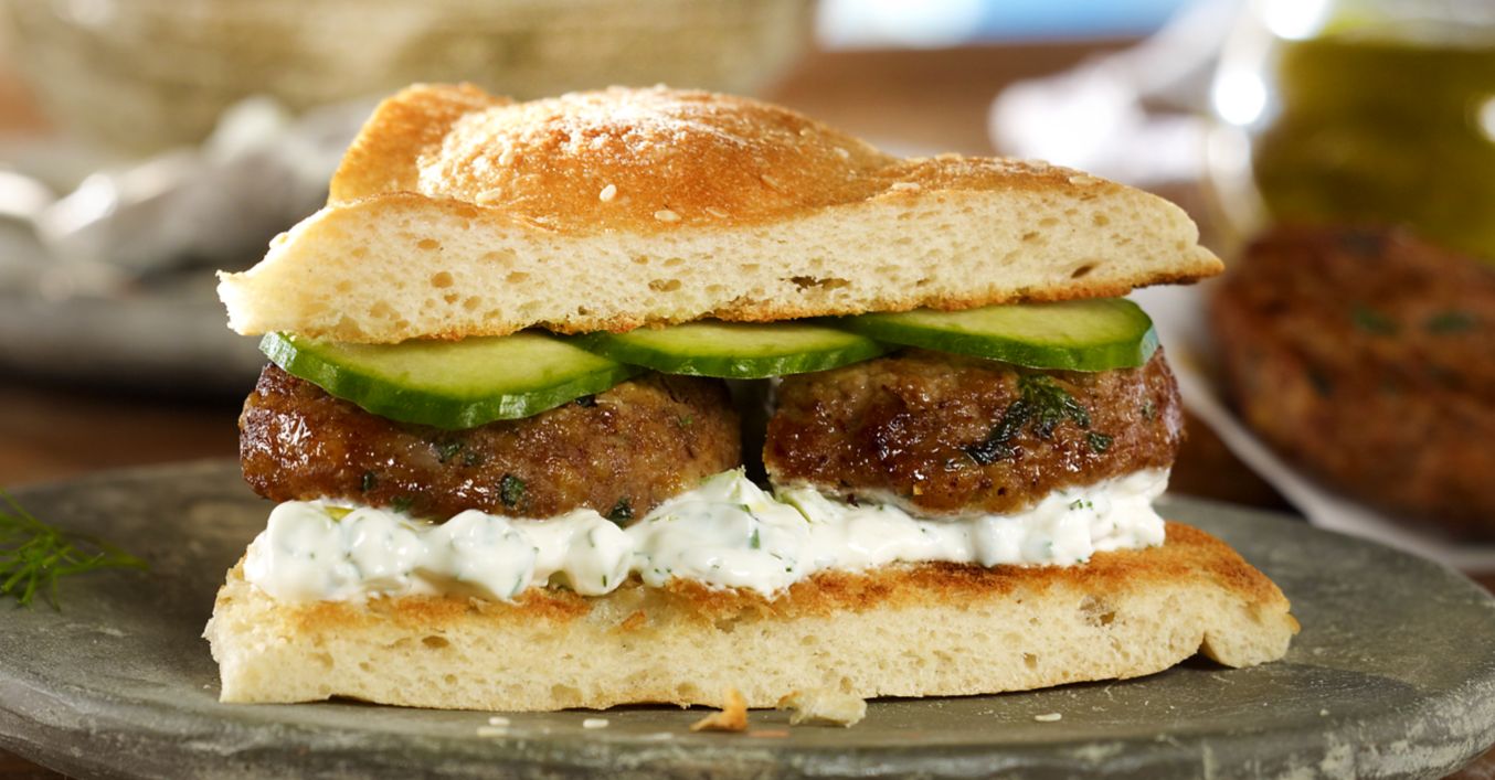 Fladenbrot nach Wunsch im Backofen knusprig aufbacken, vierteln und aufschneiden. Die Viertel mit Joghurt bestreichen, mit Köfte und Gurkenscheiben füllen und servieren.