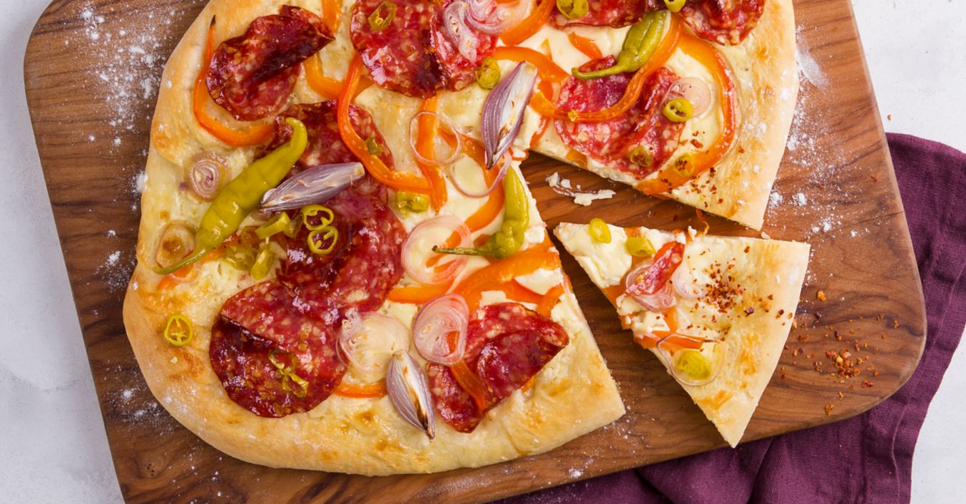 Teig mit Paprikastreifen, Zwiebelringen, Salamischeiben und Peperoni belegen und im vorgeheizten Ofen bei 250 °C (Umluft: 220 °C) circa 10 bis 15 Minuten backen.