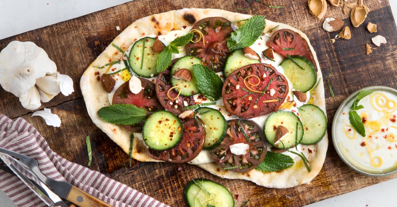 Flatbread mit Knoblauchsoße bestreichen, mit Gurken, Tomaten und Minze belegen, mit Chiliflocken und Mandeln bestreuen und warm oder kalt genießen.