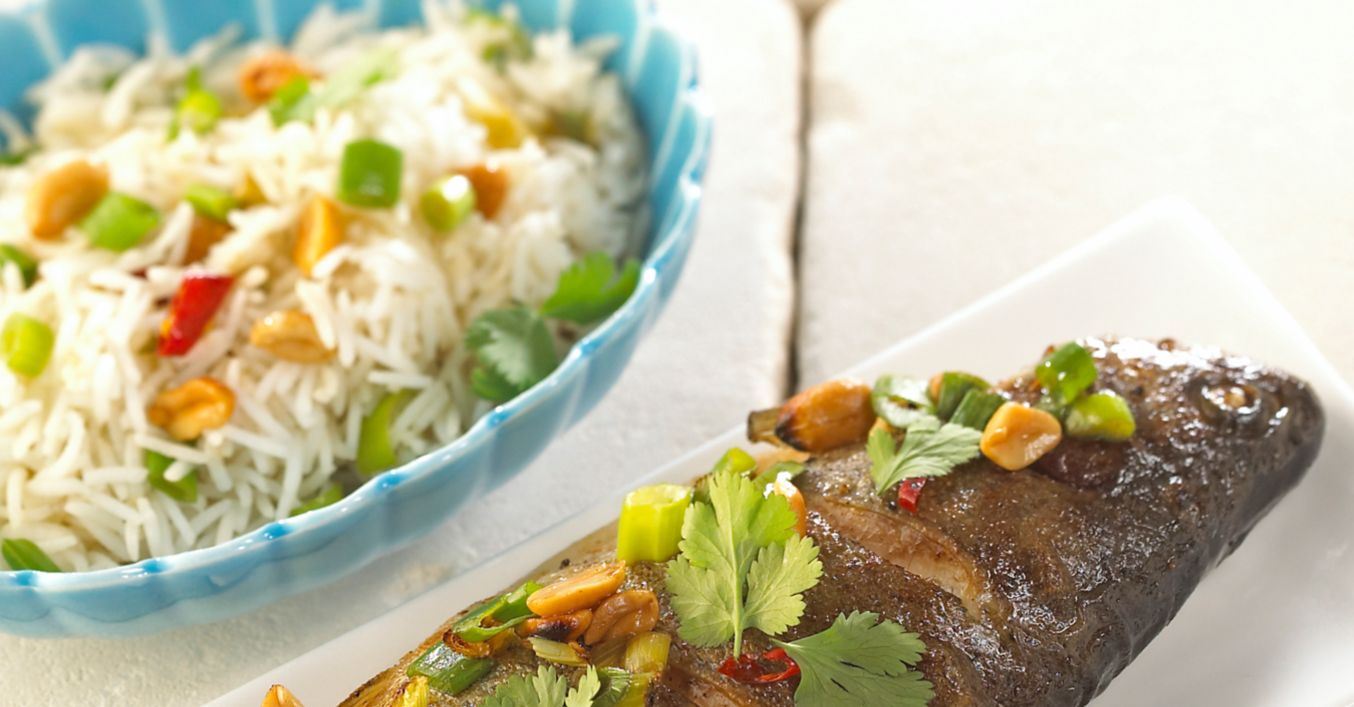 Basmatireis mit restlichem Koriander sowie gehackten Erdnüssen vermischen und zu den Forellen servieren.