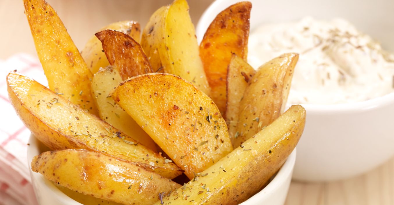 Kartoffelecken mit Meersalz würzen und mit dem Joghurt-Dip servieren.