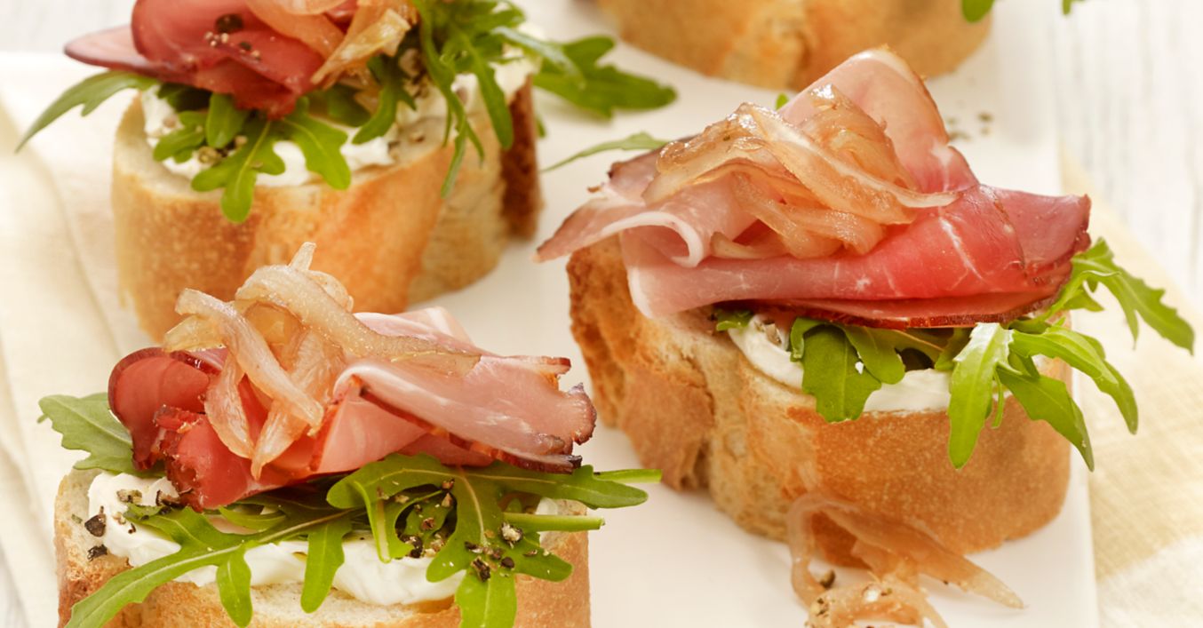Rucola waschen, putzen und in mundgerechte Stücke zupfen. Baguette in 12 dicke Scheiben schneiden, mit Frischkäse bestreichen, mit Rucola, Schinken und Zwiebeln belegen und servieren.